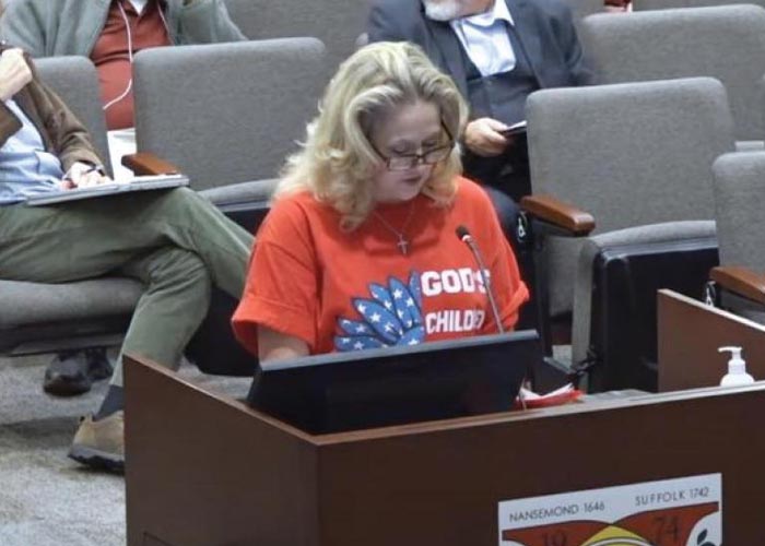 Angela Kilgore se ofreció a orar durante su tiempo de comentarios públicos en una reunión de la Junta de Escuelas Públicas de Suffolk en agosto.